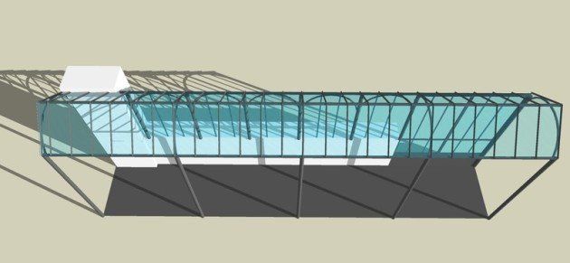 Die Baugruppe besteht aus T-Eisen-, Winkeleisen- und Flacheisen-Verstärkungsholmen, die ungefähr 500 Laufmeter Fittings darstellen. Es besteht auch aus Dachöffnungen. In der Länge des Gebäudes schneiden 48 Felder das Ganze. Auf jeder Seitenfläche befinden sich 19 vertikale Felder.