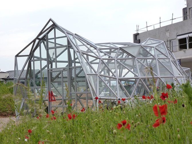 Das Gewächshaus ruht auf dem Dach.