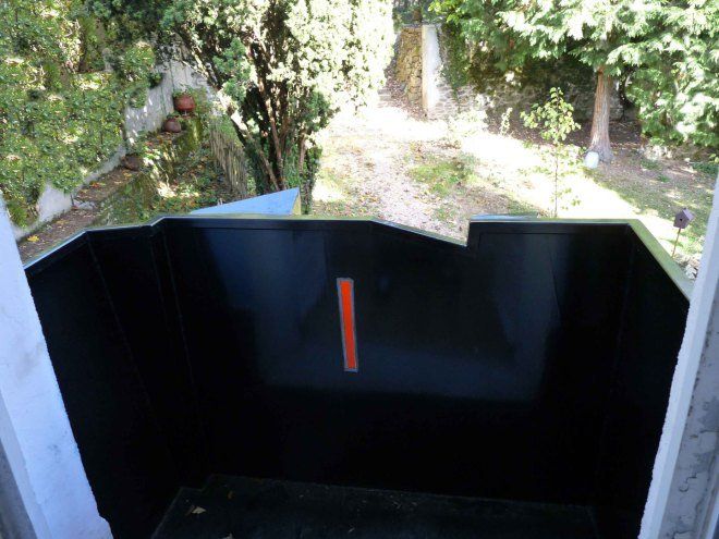 La entrada está en el lado estrecho, para una salida a través del extremo del invernadero más ancho, que se abre al jardín de los sentidos.